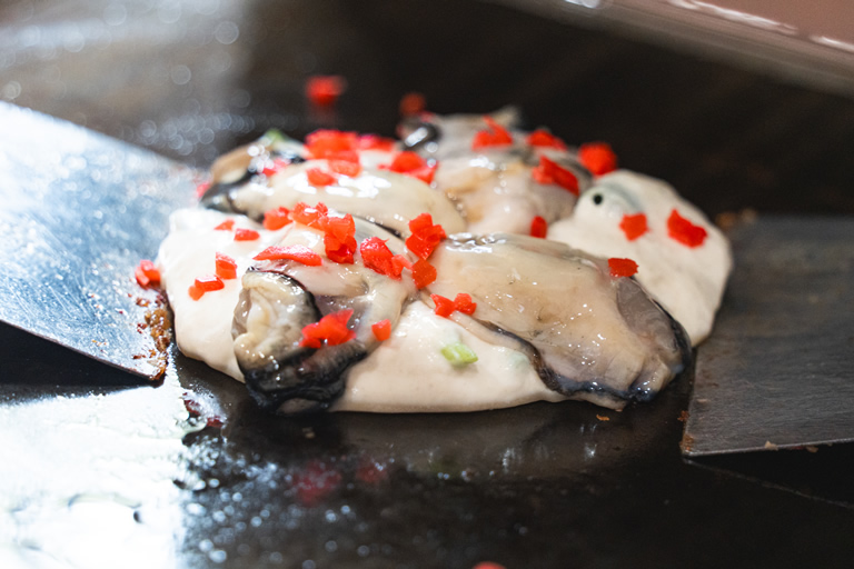 体験ツアーには含まれていませんが、ソース・牡蠣しょうゆ・塩ポン酢の味が選べる「伝馬焼き」500円も人気。大きな牡蠣が入っていて食べ応え満点。