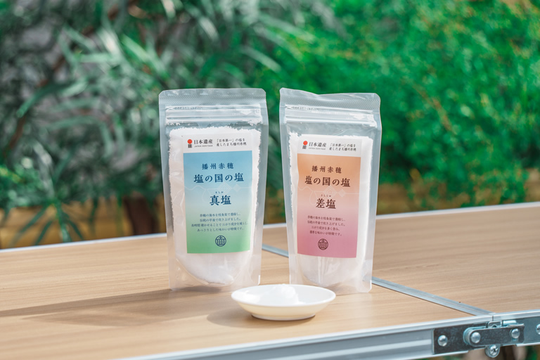▲ 伝統の平釜で炊き上げた「真塩(ましお)」と「差塩(さししお)」