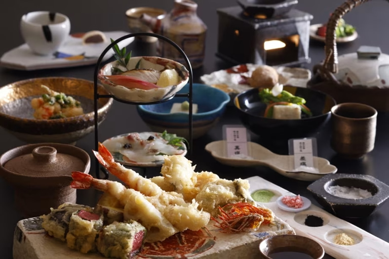 夕食は、料理人さんが目の前で揚げてくれる天ぷら会席。
