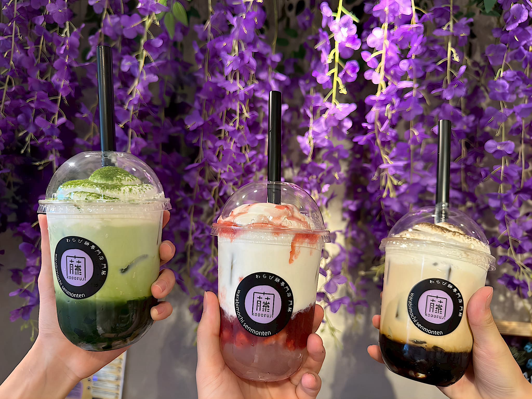 わらび餅ドリンク商品“WARABI-TA”(750円)と藤の花