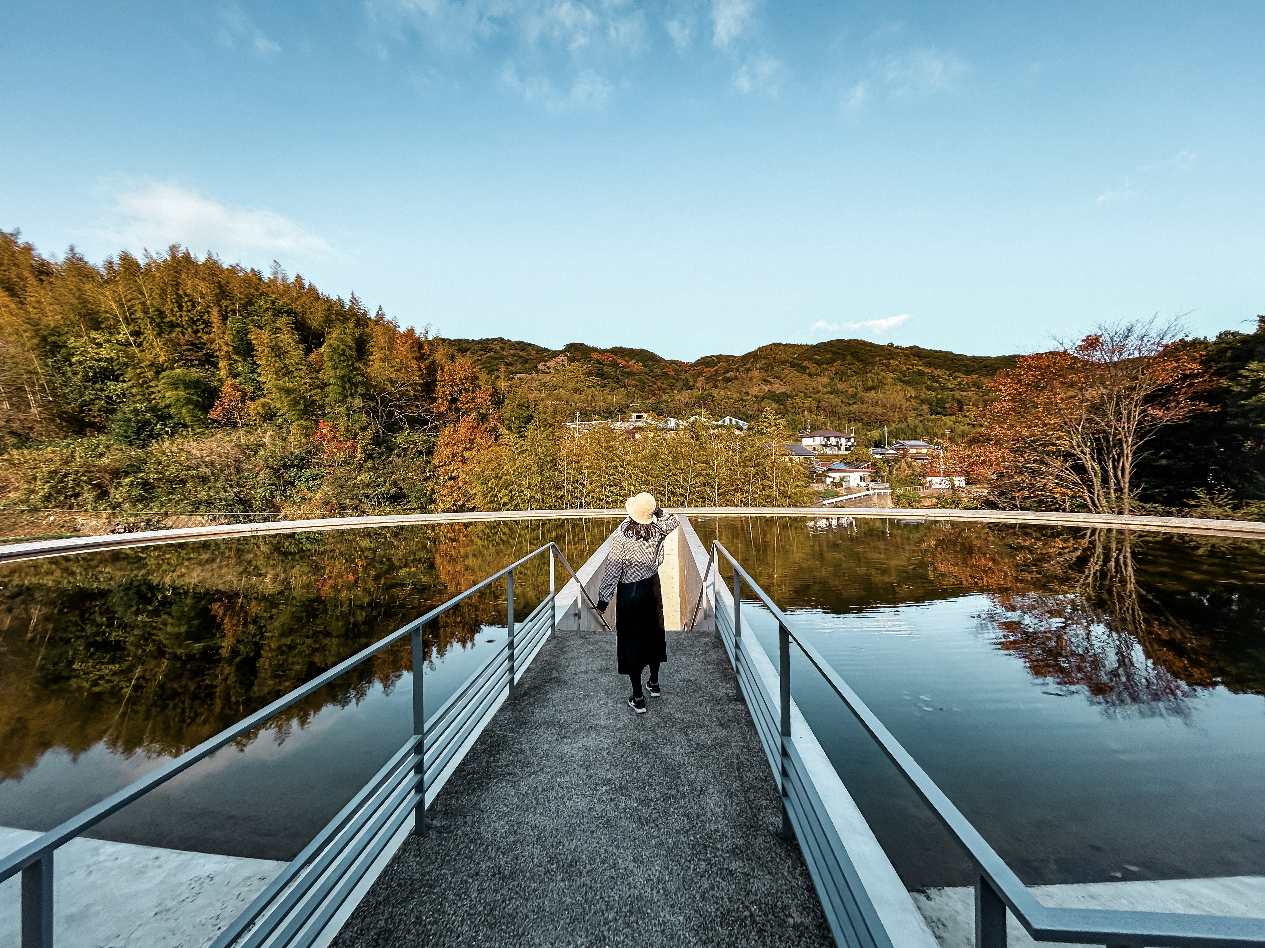 この日は冬のはじまり。蓮の花には出合えませんでしたが、キラキラと水面に光を受けながら山と空が映る池は見応えがありました。蓮池を分け入るように階段を降りて地下の水御堂に向かうときには、神様がつくった光から、人がつくった陰に入るような不思議な感覚に……。