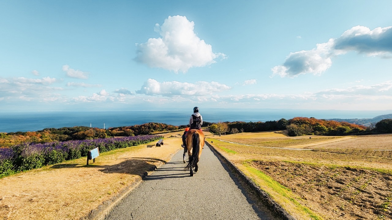 乗馬クラブ「ハーモニーワールド」では、エキスパートからビギナーの人まで乗馬と自然を楽しめます。乗馬は子どもの頃以来で最初は緊張しましたが、スタッフの「落ちないから安心してください」のことばに、ホッと肩の力が抜けました。目の前に広がるのは、自分の足で歩くより高い目線の景色。爽快感と一緒に映画の主人公になった気分を味わいました。