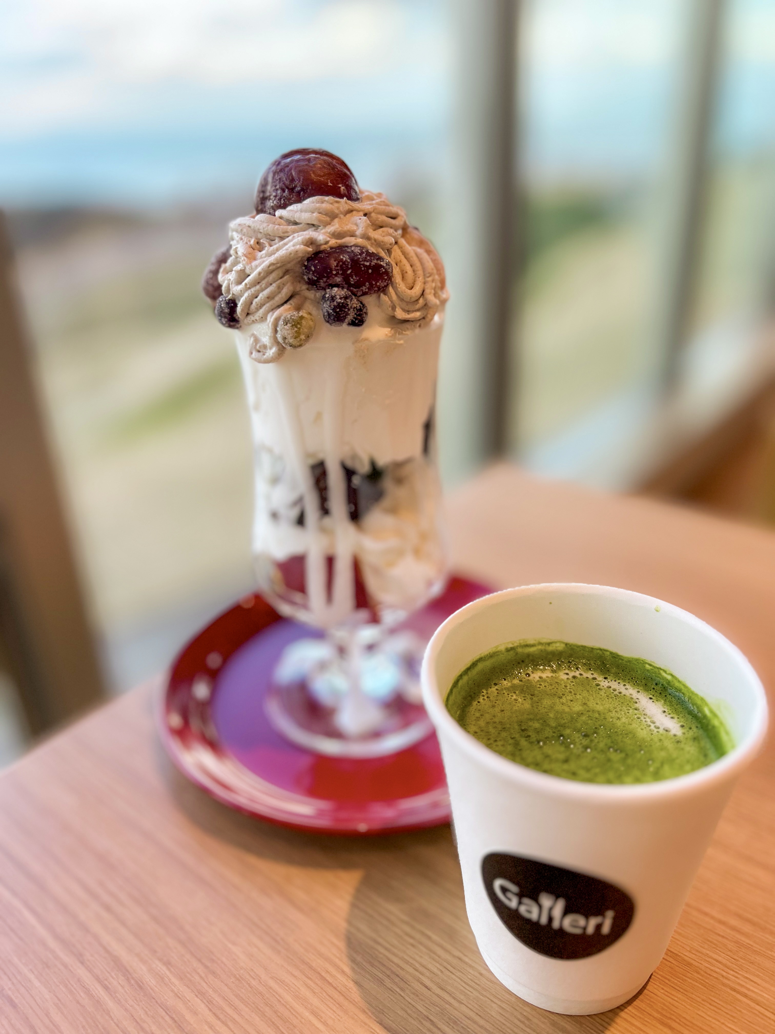 「ホット抹茶ラテ」と「モンブランパフェ」(季節により提供メニューが変更されています)でホッと一息。モンブランパフェは初めて食べました。アイスとさつまいも、栗の組み合わせがおもしろい食感。「Galleri」では、ぜひ窓のそばの席へ。景色がいいし、スイーツの写真を撮るときに光が入ってきれいな仕上がりになりますよ。