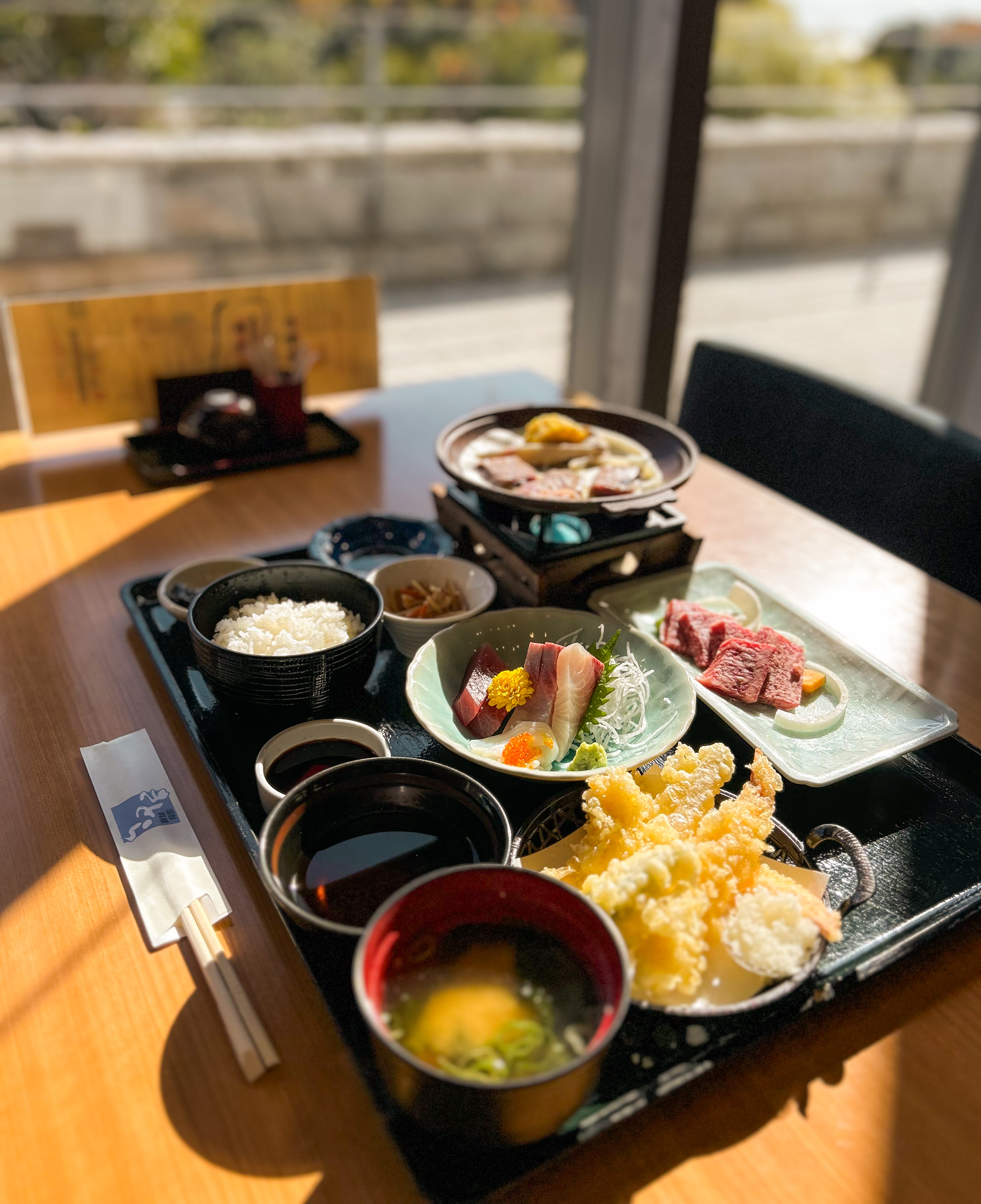 ランチは「海鮮料理きとら 淡路夢舞台店」で。黒毛和牛の焼き肉、海鮮や野菜の天ぷら、刺身が味わえる『まんぷく御膳』をオーダーしました。初めて黒毛和牛を食べたのですが、ジューシーで口の中でとろけるような食感に感激。天ぷらはサクサクッ!刺身はとっても新鮮で、歯応えがありました。