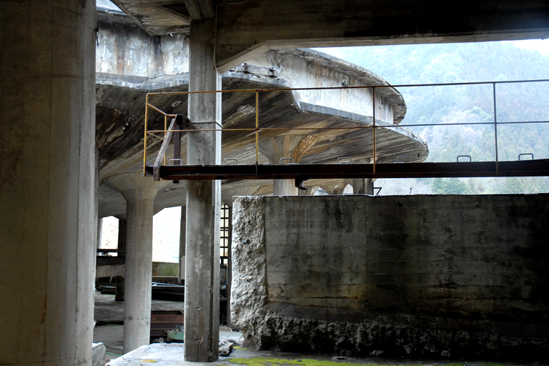 神子畑選鉱場跡は、静かな山の中に突然、現れます。