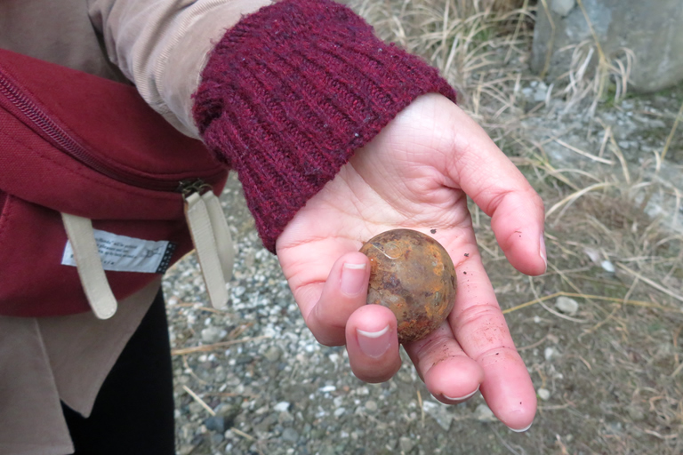 実際に粉砕に使われた小さな鉄の玉を手のひらに乗せてもらうと、ずっしりと重い。錆や泥がついていて、時の流れを感じます。
