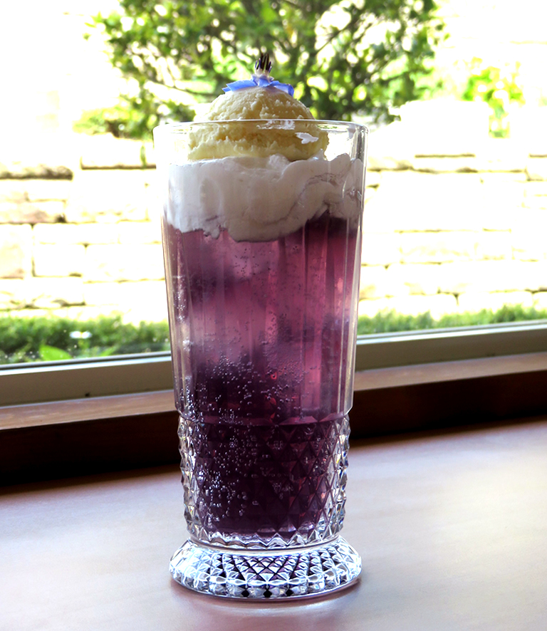 ラベンダーを満喫するのにもう一つおススメなのが、園内の『喫茶ラベンダー』で販売されているラベンダークリームソーダ。こちらの無農薬ラベンダーから抽出したエキスがそのまま使われていて、口の中がラベンダーの香りでいっぱいになります。カラダの内側からいい香りになる感じ。キレイな色は写真映えもバッチリです。