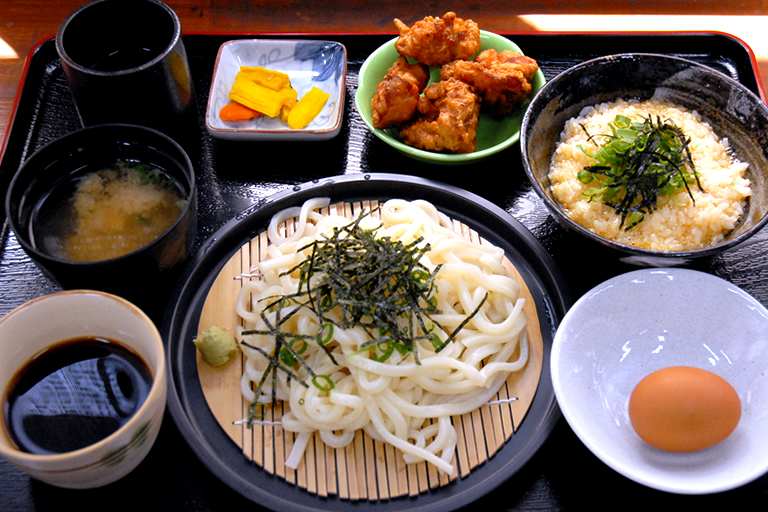 卵かけご飯食べ放題と、おうどん、唐揚げがセットになった「多可あじわい御膳」950円(税別)もボリューム満点で人気です。