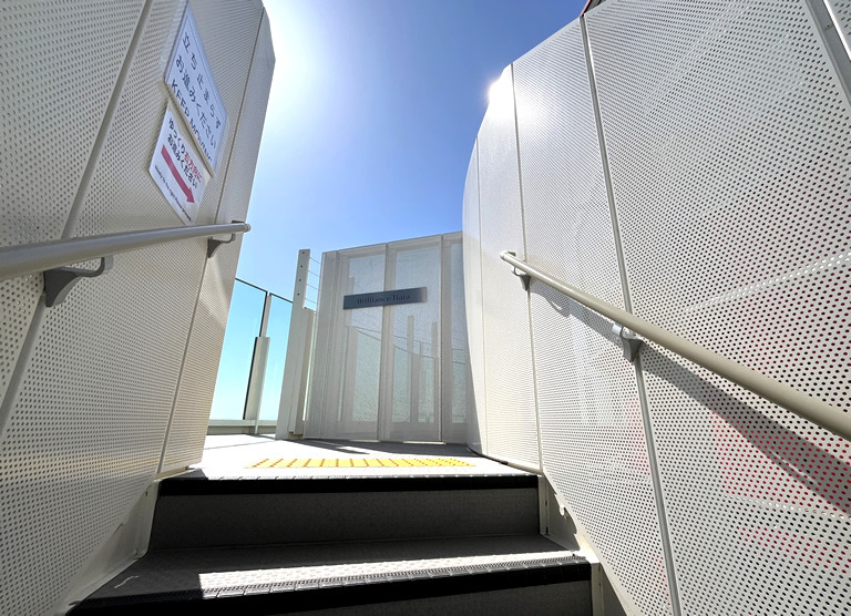 タワーの醍醐味は景色なので、スタートはやっぱり屋上!ということで、まずはリニューアルの目玉、「屋上デッキ」へ。2階の出発ゲートからエレベーターで向かいます。神戸ポートタワーは、展望フロア(入場有料)と低層フロア(入場無料)の構成。「屋上デッキ」へは、エレベーターが到着する「展望5階」から階段を上ります。