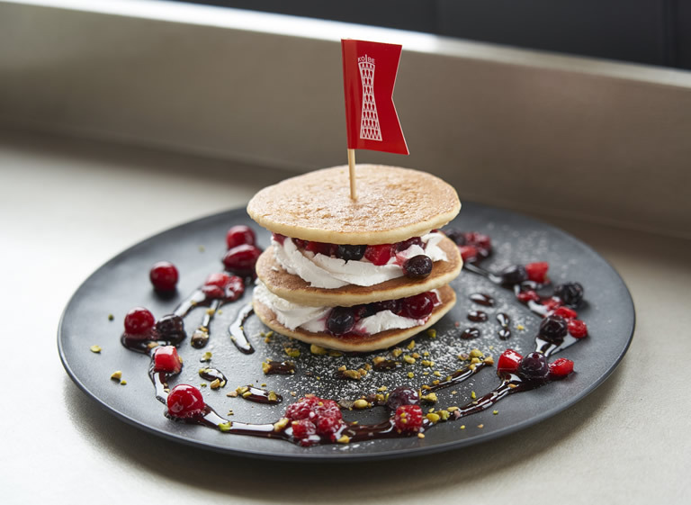 メニューは時間帯によって異なります。写真は「真っ赤なベリーの神戸ポートタワーパンケーキ」。SNS映えする可愛いスイーツや軽食が揃っています。