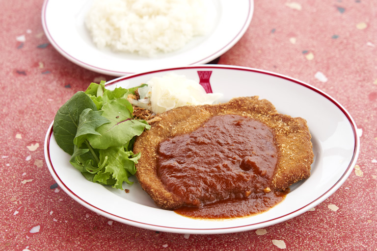 料理は、神戸ポークや但馬牛、淡路鶏など、兵庫ならではの食材にこだわった“レトロ洋食”がテーマ。写真は「神戸ポークデミカツ」。
