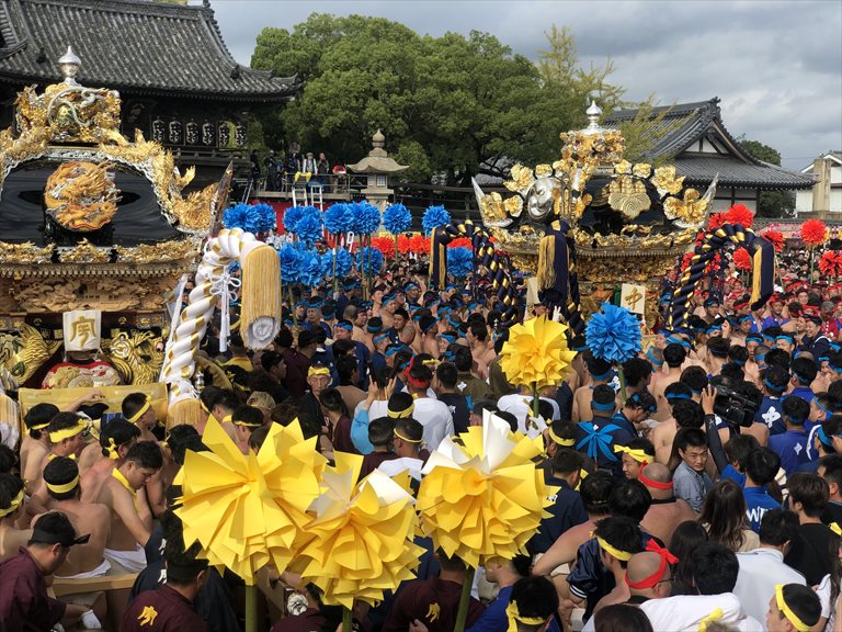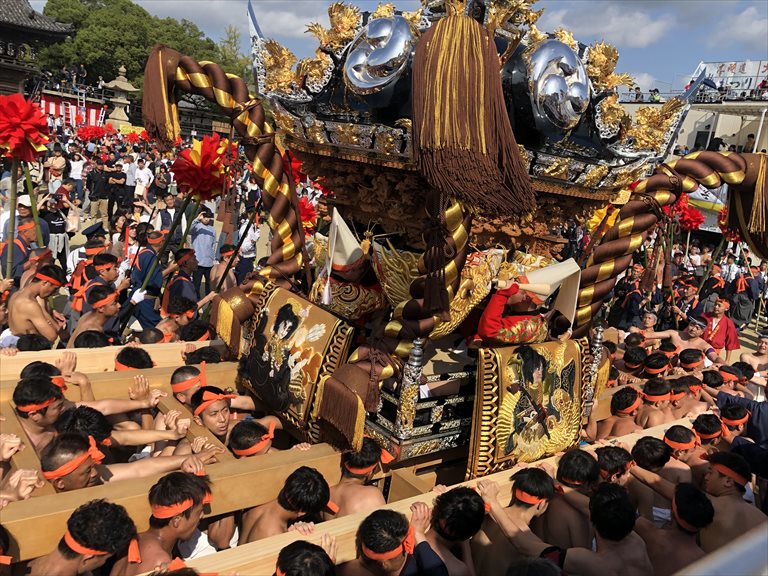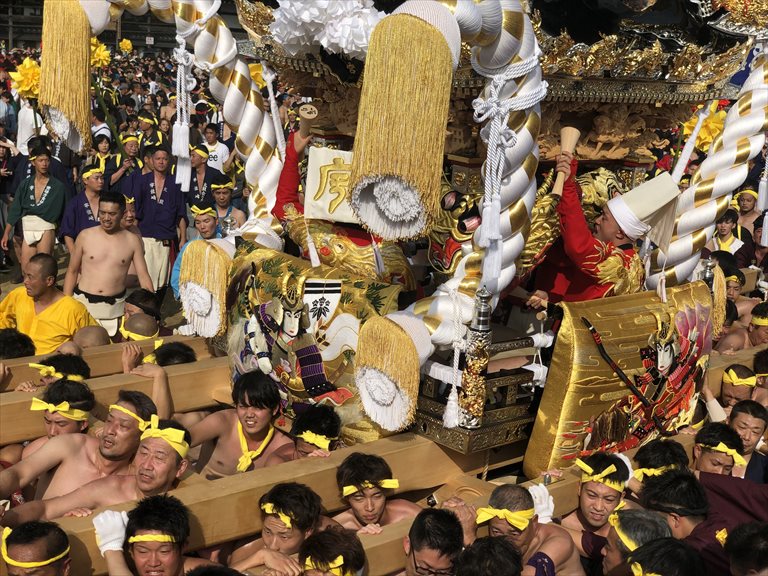 ふんどしを締めて、人力でこんなにも大きく重厚な屋台を2日間も担ぎ、ぶつけ合う祭り、どれほど大変か、想像以上のはず!