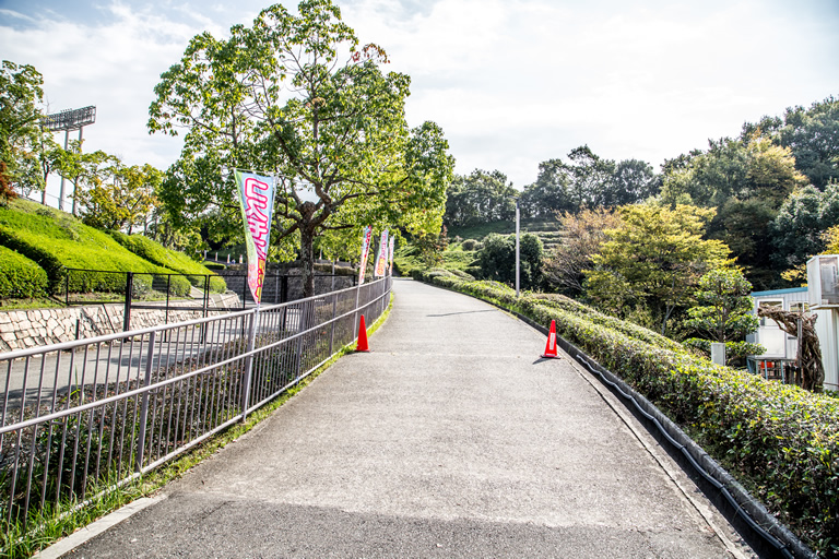 コスモスの丘に行くまでの道からはユニバー記念競技場を見ることができます。
