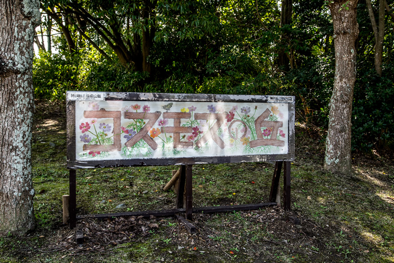 さらに坂道を登っていくと、コスモスの丘の入り口には温かみのある手書きの看板が設置されているのが見えてきました。