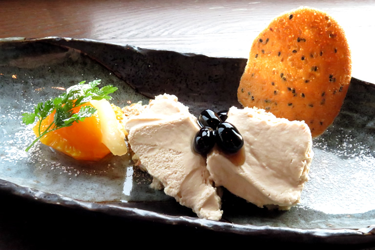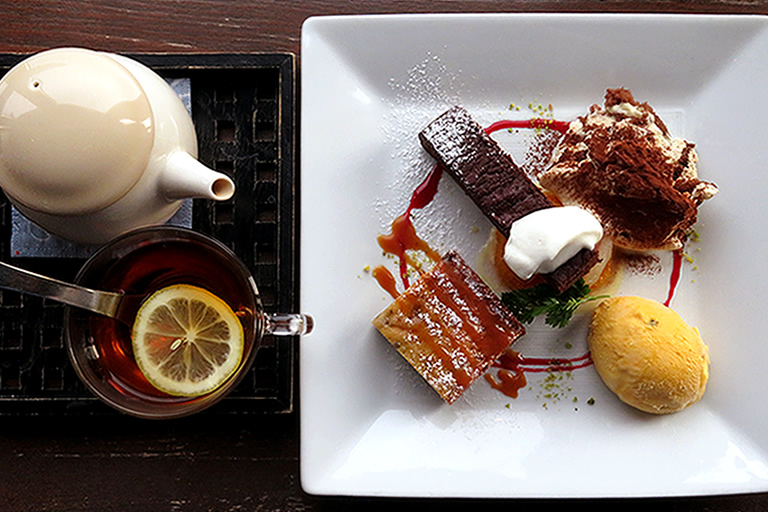 モダンなインテリアの店内からは、抜群の眺望が楽しめます。頂いたのは、丹波黒種黒大豆のティラミス グラニット風770円。友人は、本日のおすすめデザート4種盛りセット1,540円をチョイス。どれも手の込んだ美味しいスイーツです。段々と色を変えていく空や海を眺めながら、贅沢な時間が満喫できます。