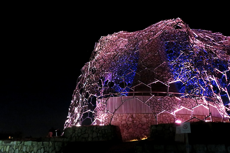 日が暮れたら再び、自然体感展望台 六甲枝垂れへ。「六甲山光のアート」と題して、1000万色以上の色彩表現ができる最新のLED照明を使ったライトアップが行われています。私が訪れた11月は秋バージョンの色で、12月からは冬バージョンに色が変わるんですよ。ここから眺める神戸の夜景も素敵です。
