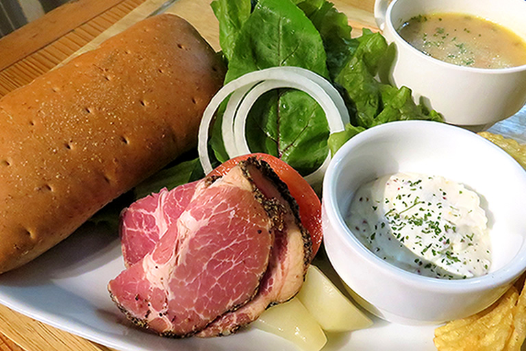 手作りのパンに、ローストビーフとサワークリームと野菜を挟み込んでパクリ。なかなかのボリューム感で、たっぷりのサワークリームが美味しい。スープも具沢山で嬉しいです。