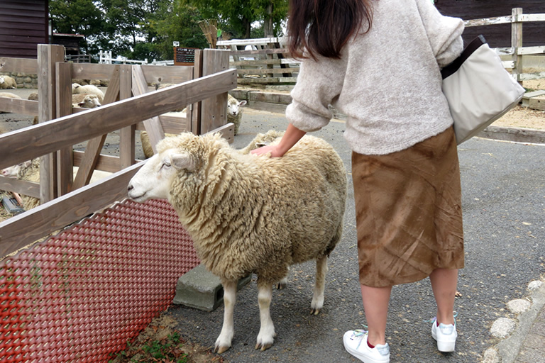 なだらかな斜面に広がる牧場は小ぢんまりした広さですが、あちこちに羊の姿が。全然人を怖がらないので、近づいたり触ったりできます。モフモフした毛を撫でていると何だか癒されます。ウサギとのふれあい体験や乗馬体験などもできます。