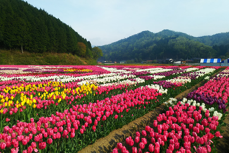 実は、フラワーアートをはじめ、「たんとうチューリップまつり」はすべて、地元の人たちの手づくりなんです。元々、但東町は兵庫県内唯一の球根生産地として知られていましたが、高齢化によって栽培農家は高齢化が減少し、「最後に一つ花を咲かせたい」との農家の思いから、町内のチューリップを一つ場所に集めたことが始まり。以来、少しずつ拡大し、今では日本屈指の規模になりました。