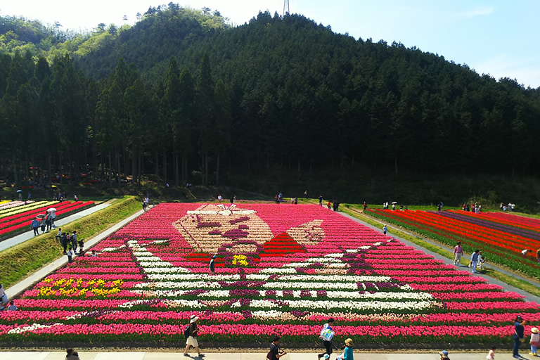 最大の見どころは、10万本のチューリップで描かれる70m×30mの巨大フラワーアート。毎年違うキャラクターが描かれ、何が浮き出るかは開花してからのお楽しみ。過去にはクレヨンしんちゃんやペコちゃんが描かれました。さて、今年はどんなキャラクターが登場するのか。展望台からフラワーアートの全景を眺めるのがおススメです。