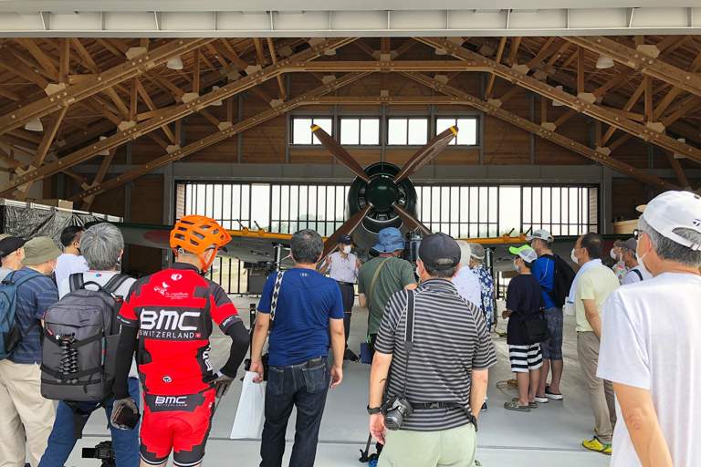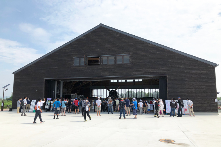 滑走路跡の北の端に格納庫を模した備蓄倉庫が建てられています。この中には、戦闘機「紫電改(しでんかい)」の実物大模型が展示されています。毎月第1・第3日曜日(10:00~15:00)に公開されています。この日も多くの方でにぎわっていました。