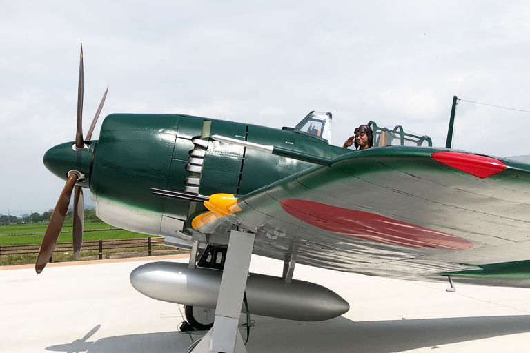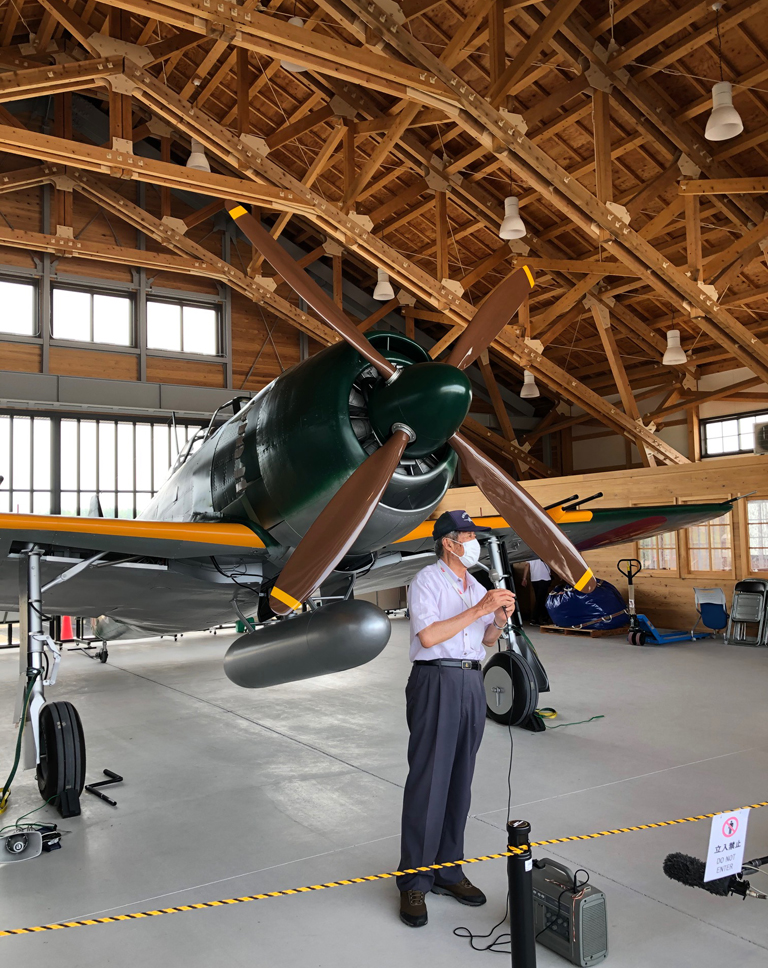 戦闘機の実物大模型とともに語られる当時の状況に耳を傾ける