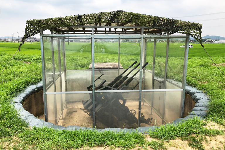 のどかな田園風景に似合わないこの機銃座跡には、実物大模型の機銃が設置されています。この模型は、平成17年に東映株式会社が制作した映画『男たちの大和』の撮影のために作成されたものだそうです。この模型は3連装ですが、実際にここに設置されていた機銃は、2連装だったそうです。