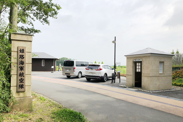 法華口駅から10分ぐらい歩くと、「姫路海軍航空隊」の看板のかかった門柱と衛兵詰所にたどり着きました。これは、平成30年8月に復元されたものだそうです。当時、訪問者との面会所があった場所は、今はトイレが整備されています。戦時中にパイロットを目指した若者たちは、どんな思いでこの門を抜け、面会の方たちとどんな話をしたのでしょう。ふっとそんなことが頭をよぎりました。