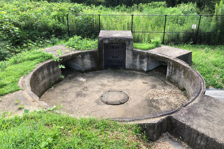 攻撃してくる飛行機を迎え撃つための機銃座跡も残っています。飛行場周辺には5カ所あったそうで、今も4カ所が残っているそうです。機銃そのものは、現在は失われていますが、当時は1分間に230発の弾を発射でき、5,000mの高さまで届いたそうです。この機銃座跡には、地下室も完全な形で残っています。