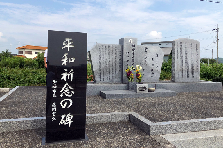 鶉野飛行場跡の滑走路の中ほどに隣接して「平和祈念の碑」があります。この碑は、平成11年に特攻隊で生き残った人たちや地元の人たち等によって建てられたもので、毎年10月の第1日曜日には、特攻隊で亡くなった63名の方と練習中に亡くなった7名の方をしのび、式典が行われているそうです。