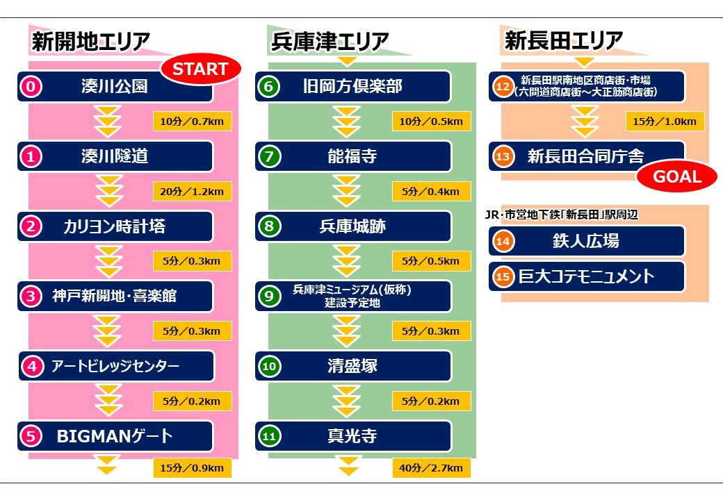 新開地・兵庫津・新長田とバラエティに富んだまちを巡る約9.2kmのウォークは、皆さんが思い描く神戸のイメージを一新するに違いありません。ぜひ、神戸西部3都を歩いてみませんか。