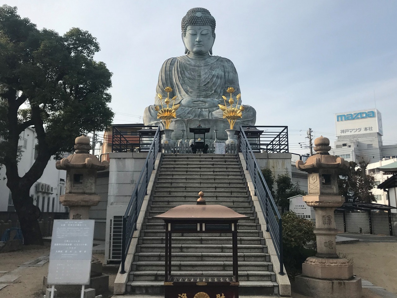 少し進んで能福寺に着くと、日本三大仏の一つである兵庫大仏がお出迎え。7mの台座の上に座っている大仏は、圧倒される存在感があります。