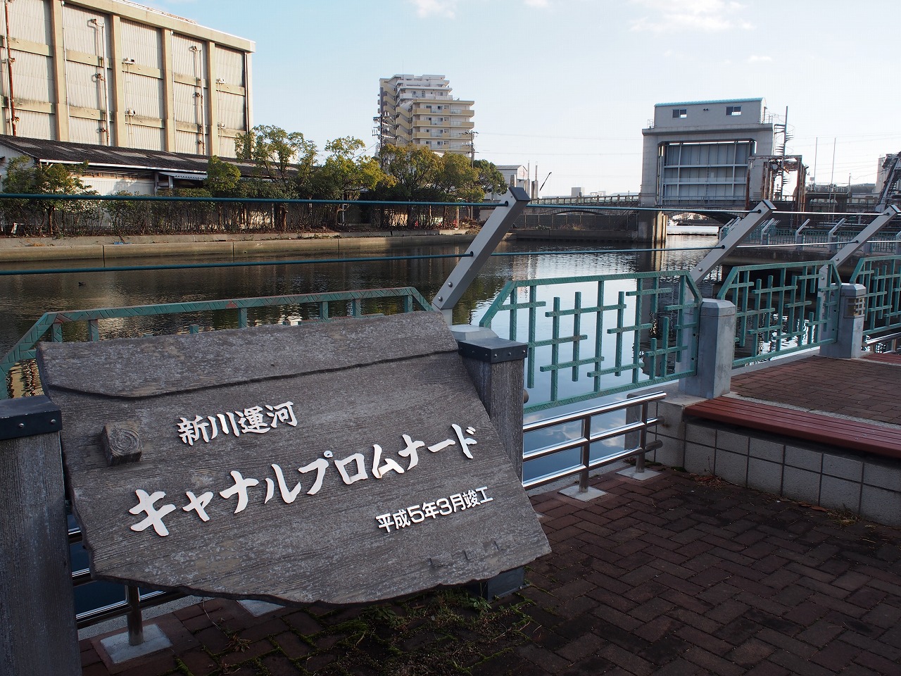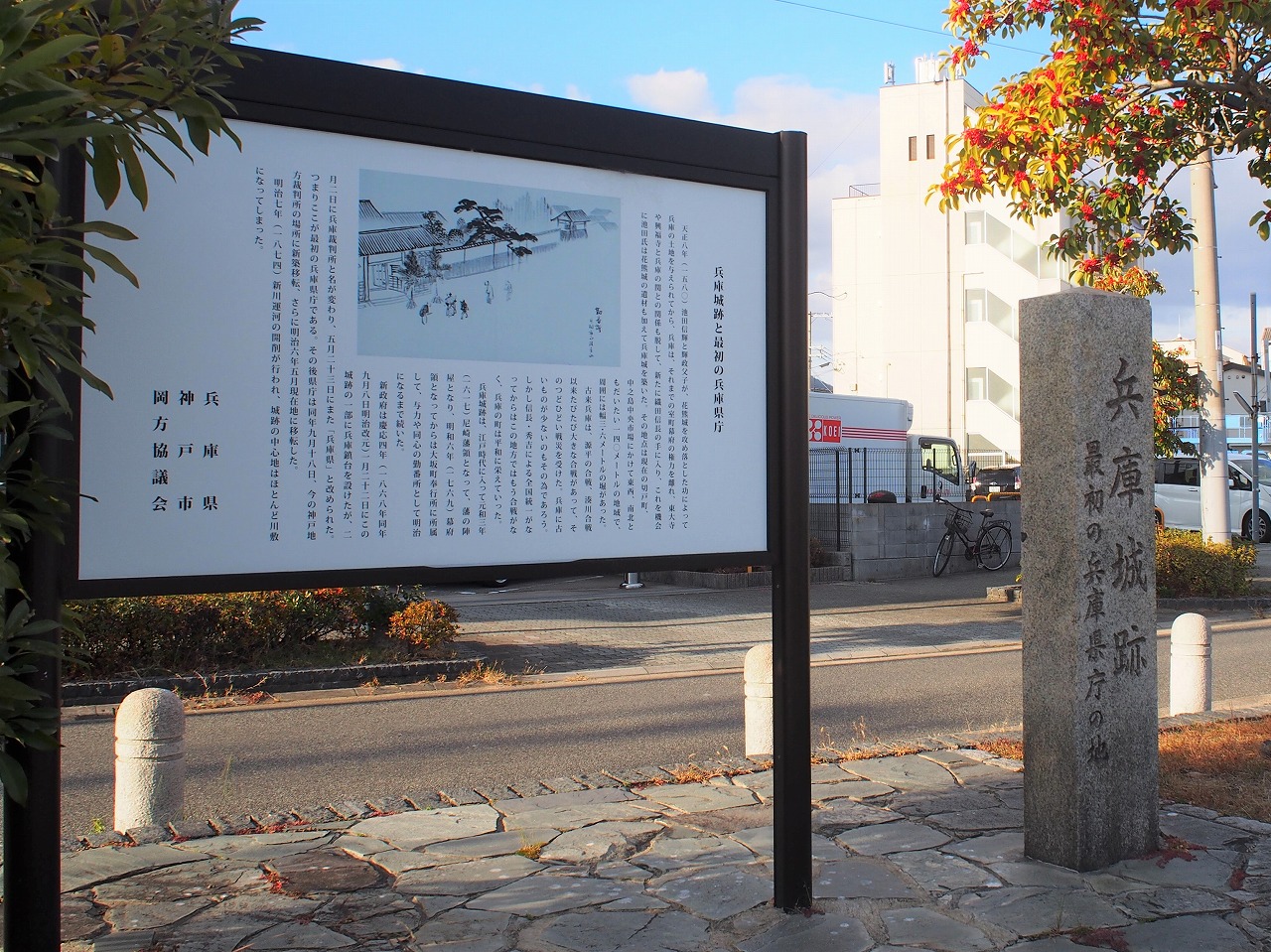 水面が輝く新川運河沿いには、かつてここに兵庫城があったことを示す石碑が佇みます。慶応4(1868)年にこの兵庫城跡の勤番所に兵庫県庁が設置されたことから、兵庫県の歴史が始まりました。大輪田橋を渡った先では、この初代兵庫県庁の復元施設である「県立兵庫津ミュージアム(仮称)」が建設されています。