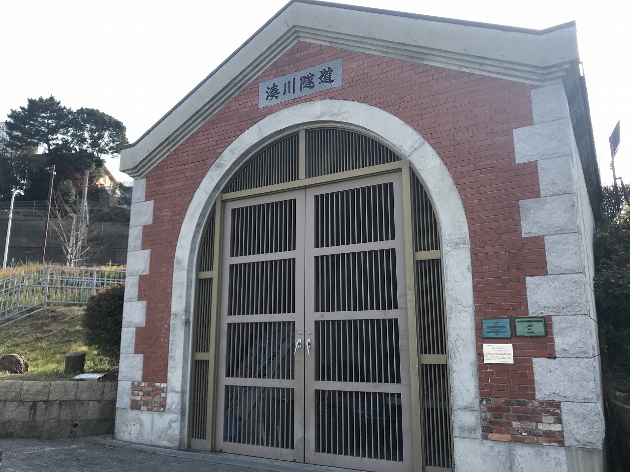 まず向かうのは、日本最初の河川トンネルとして誕生し、新湊川の水を100年間流し続けていた湊川隧道。緩やかな坂道を10分ほどのぼって到着した隧道は、外観からも歴史を感じられる造りで、国登録有形文化財に指定されています。月に一度の一般公開日にはトンネルの内部を見学することもできます。