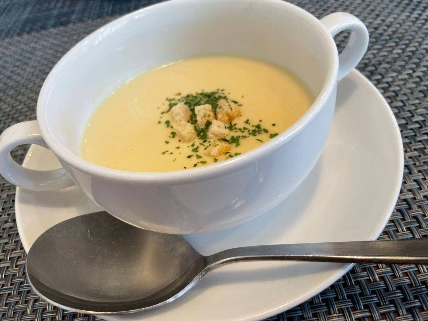 ランチメニューには「本日のスープ」がついています。この日はコーンポタージュスープ。