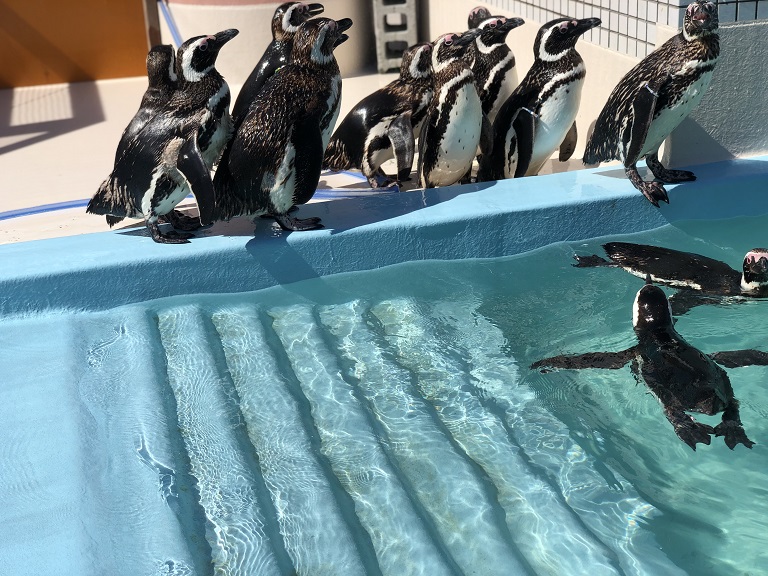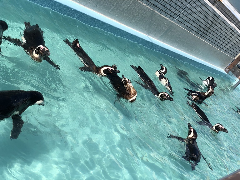 そこを抜けると屋上展望広場「水辺のふれあい遊園」。なんとなんと、ペンギン達がたくさん泳いでいました!!!ワクワクしながら眺めていると、「ウォー!」と鳴き声が!本当に可愛い。