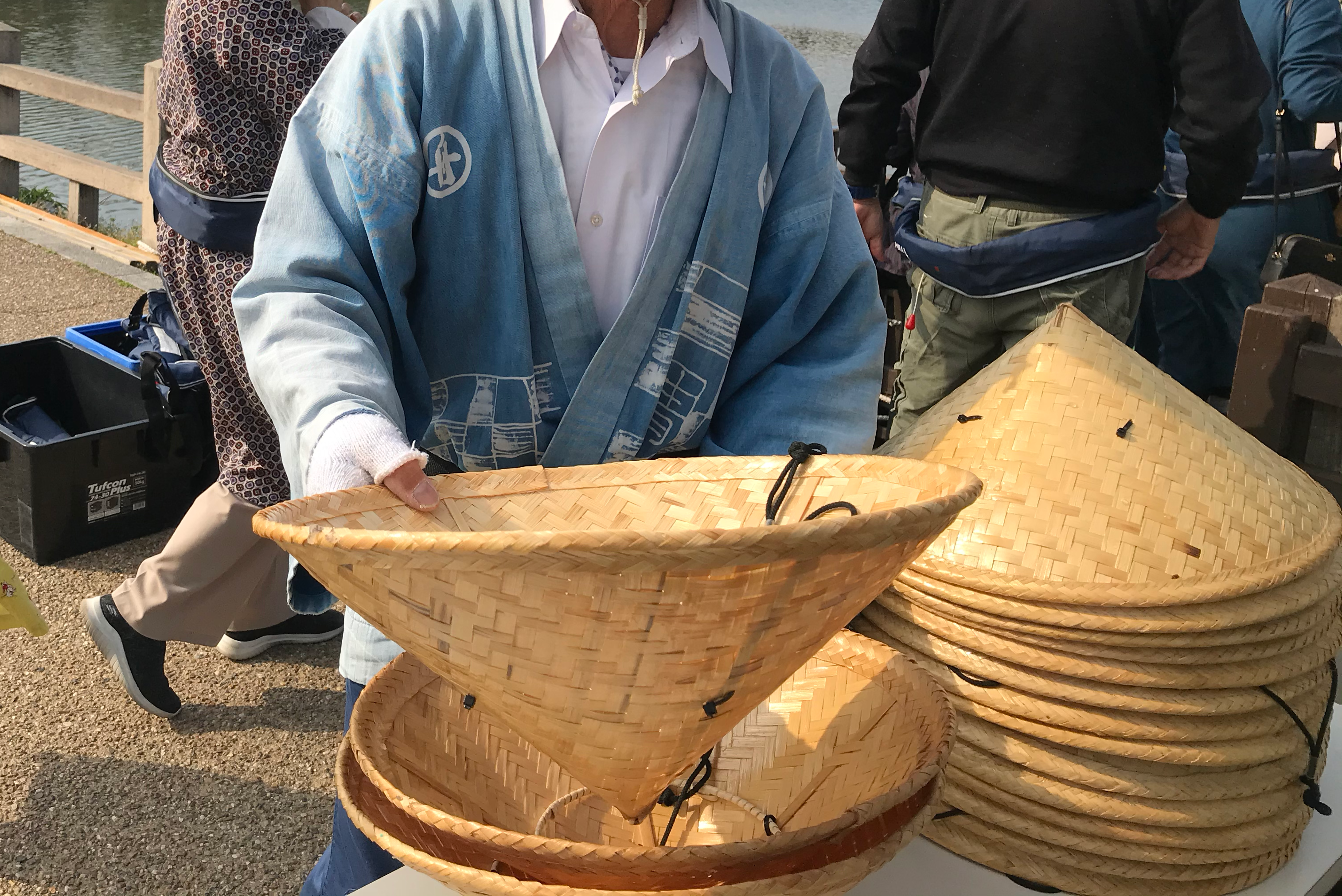 乗船する前、シートベルトと和が感じられる笠を着用します。