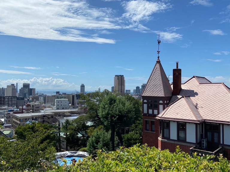 3つ目は、館の後ろにある、北野天満宮からの写真です。長い階段を登っていくと、神戸を一望しながら館の写真を撮ることができます!