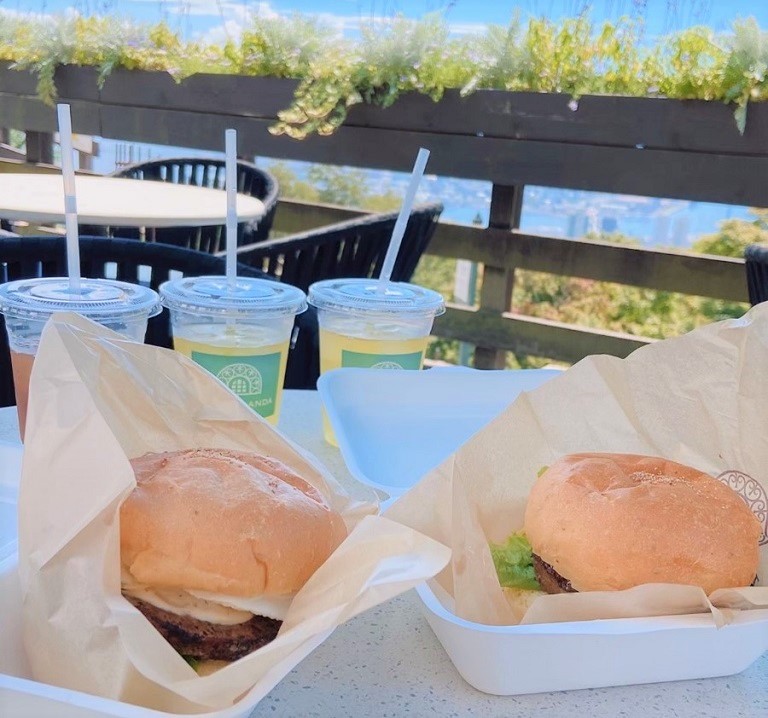 布引ハーブバーガやハーブティーなどハーブ園ならではの商品が販売されています。開放感あふれるテラス席でお食事をいただくことができました。
