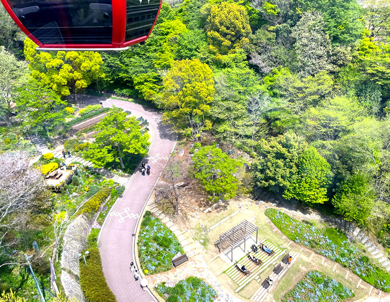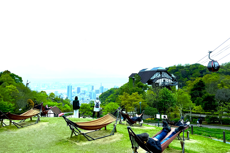 ロープウェイ「中間駅」を通り過ぎると、「神戸布引ハーブ園」の散策を楽しむ人やハンモックでリラックスしている人が見えます。