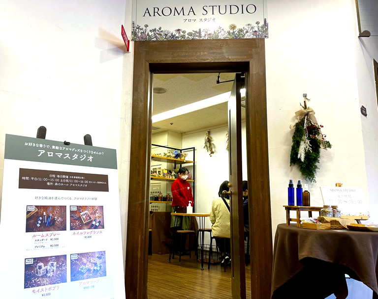 人気は、ルームスプレー(1,500円~)やネイルフレグランス(1,800円)づくり。所要時間約20分で、事前予約は不要なので、気軽に体験できます。
