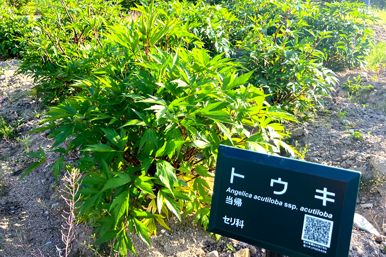「ハーブ・バラエリア」には、“漢方の里”のルーツで、三大薬草の一つでもあるオウレンやトウキも育っていました。