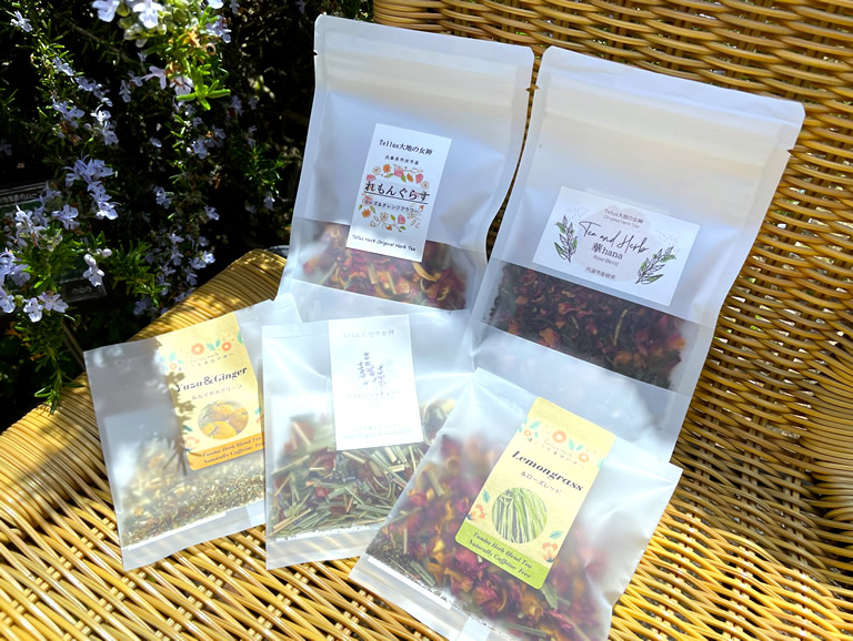 「Tellus大地の女神」では、丹波市産を中心に、農薬・化学肥料無使用の自然栽培のハーブを使った手作りのハーブティーも販売。「丹波市立薬草薬樹公園」でも購入できます。