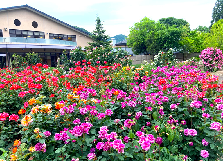 リフレッシュ館のすぐ裏手にある「ハーブ・バラエリア」には30種類約200本のバラが植えられていて、例年5月から赤、ピンク、オレンジなど、色とりどりの花が次々と開花。6月中旬まで見ごろが続くそうですよ。