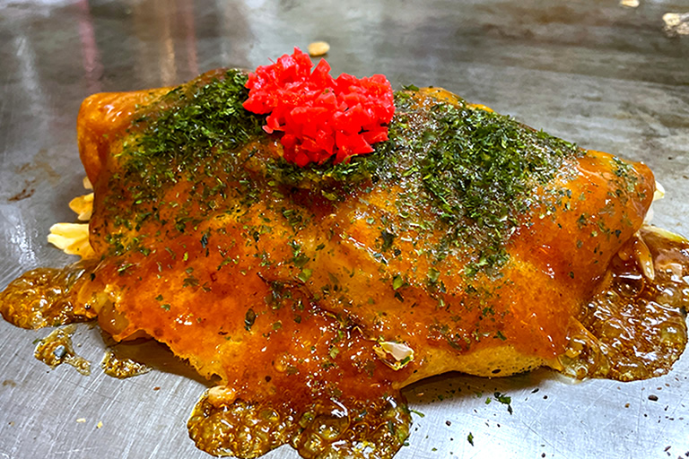 生地がパリッと香ばしくなるまで焼いたら、ひっくり返します。キャベツがしんなりしたら半分に折り、ソースを塗って完成!