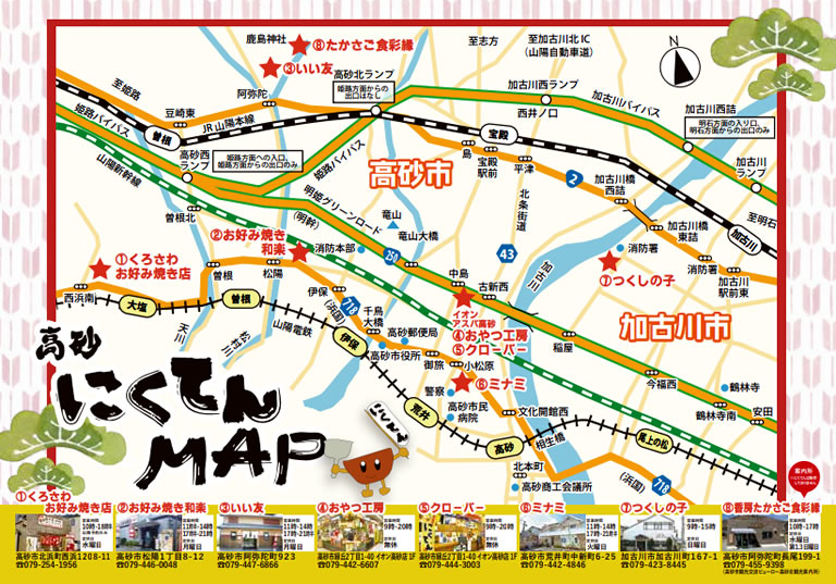 『高砂にくてんの会』参加店舗は市内に8店舗あり、「高砂にくてんMAP」も用意されています。駅前の観光案内所などでももらえるので、にくてんめぐりや食べ比べも楽しいと思います!