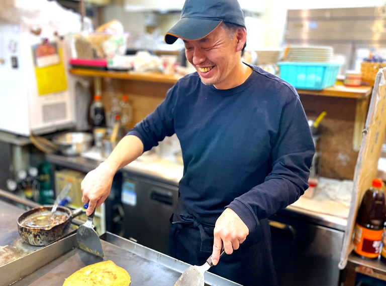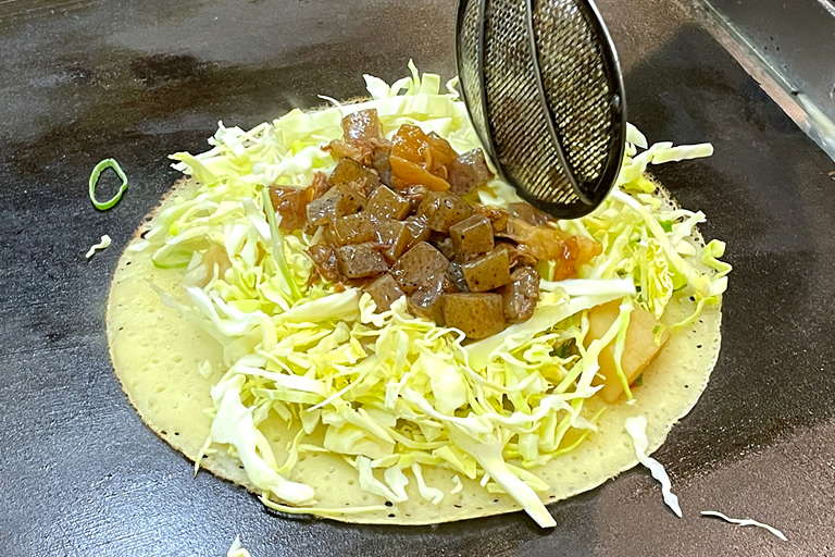 地元の老舗肉店のご店主曰く、昭和初期、この辺りではまだ豚肉は食べてなくて、肉と言えば牛肉だったそうです。だから、豚肉を入れて焼く、今の一般的なお好み焼きはまだなかったので、お好み焼きにおでんの具を入れたというわけではないんですよ』。