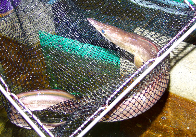 鱧ってすごく細長い魚のイメージでしたが、新島水産の水槽で泳いでいるのはとっても大きい!