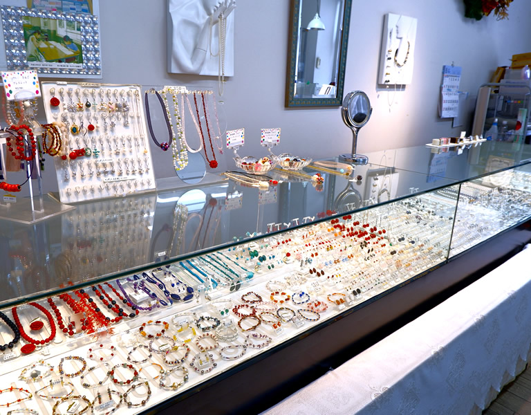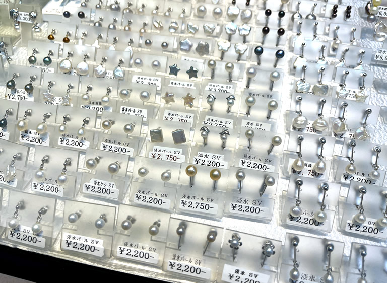 店内の商品のほとんどが工房で手作りされたもので、ユニークなデザインと手ごろな価格が魅力です。2,000円台から多彩なデザインが揃う真珠のピアスは、観光客にも大人気だそう。