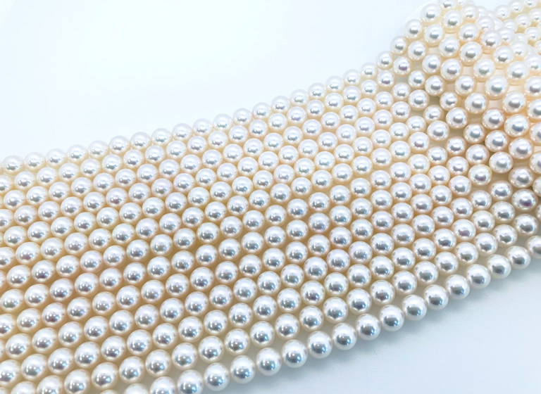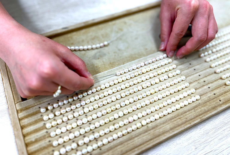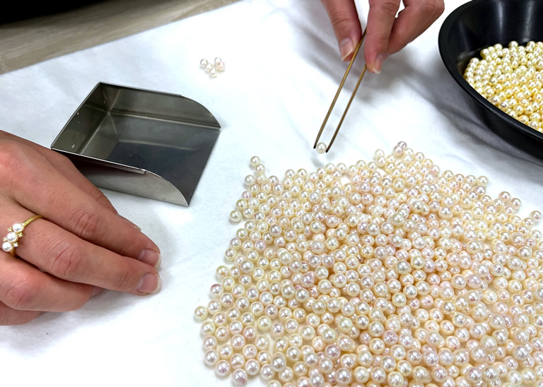 例えば、選別作業は真珠屋の基本で、サイズ、色、巻き、照りなどを見極めて一粒ずつ選り分けていきます。同じ等級の粒の中から、さらに輝きや色合いなどを緻密に合わせて並べ、ネックレスにするのが連組み。